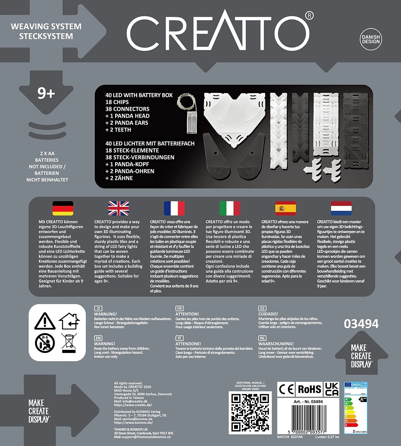 Creatto - vienkārša, bet universāla sistēma, kurā ir tikai divi galvenie komponenti, kurus var apvienot bezgalīgos 3D veidojumos. Izturīgās un elastīgās plastmasas detaļas ir ātri un viegli savienojamas visos prasmju līmeņos; nav nepieciešami papildu materiāli vai aprīkojums! Katram Creatto komplektam ir instrukcijas četru dažādu konfigurāciju izveidošanai, taču iespējas ierobežo tikai jūsu iztēle. Pievienojiet krāsainas gaismas diodes, lai izgaismotu jūsu mākslas darbu no iekšpuses.