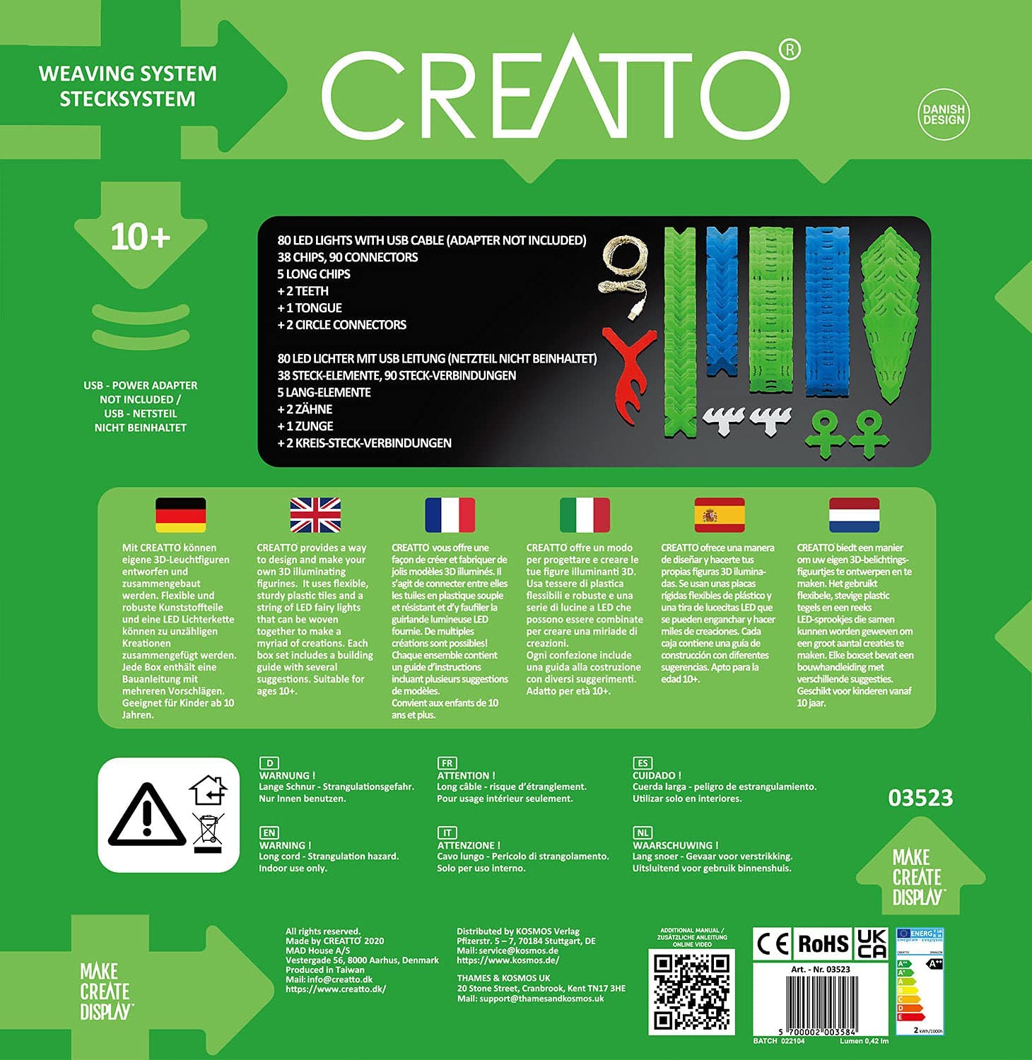 Creatto - vienkārša, bet universāla sistēma, kurā ir tikai divi galvenie komponenti, kurus var apvienot bezgalīgos 3D veidojumos. Izturīgās un elastīgās plastmasas detaļas ir ātri un viegli savienojamas visos prasmju līmeņos; nav nepieciešami papildu materiāli vai aprīkojums! Katram Creatto komplektam ir instrukcijas četru dažādu konfigurāciju izveidošanai, taču iespējas ierobežo tikai jūsu iztēle. Pievienojiet krāsainas gaismas diodes, lai izgaismotu jūsu mākslas darbu no iekšpuses.