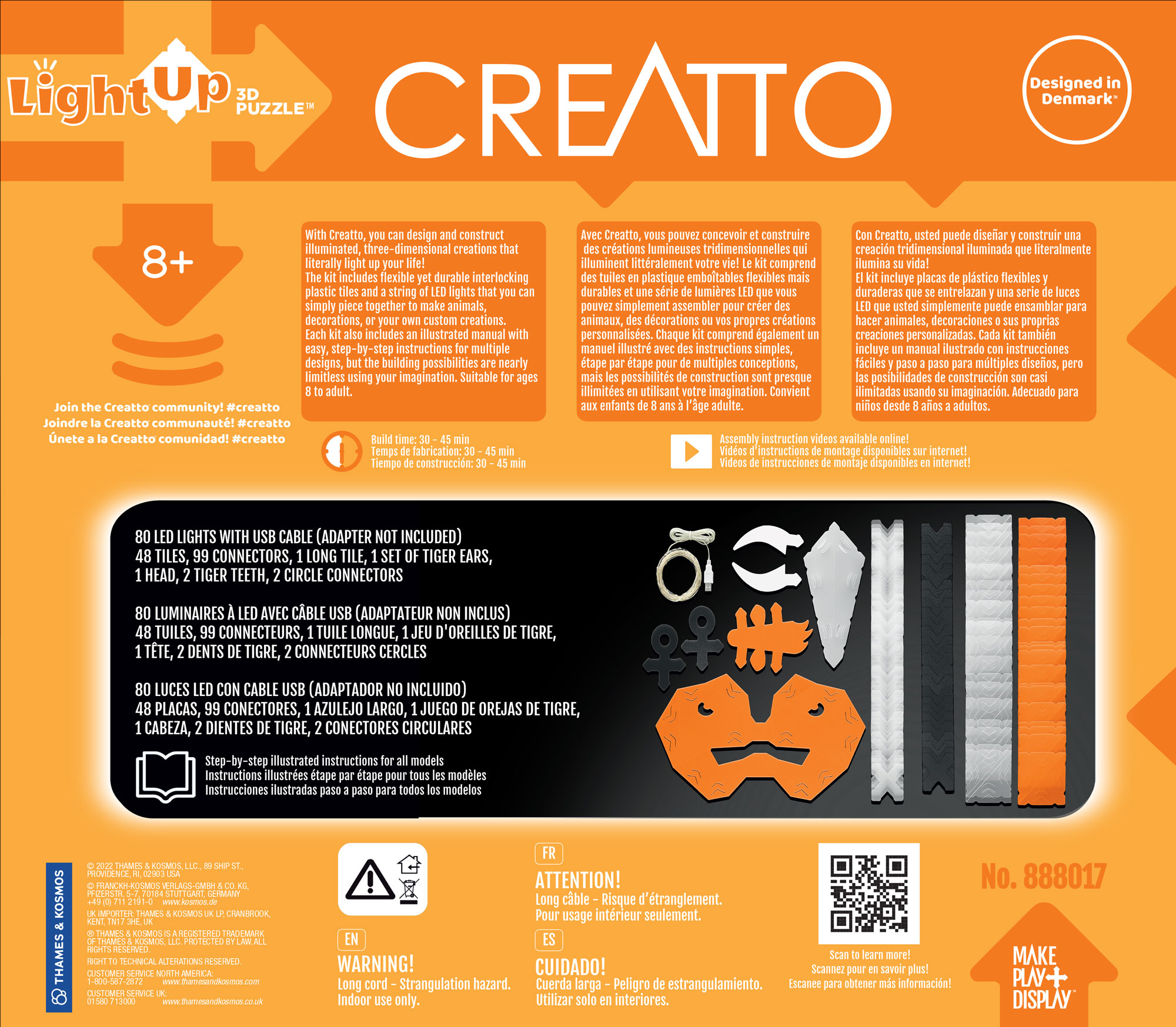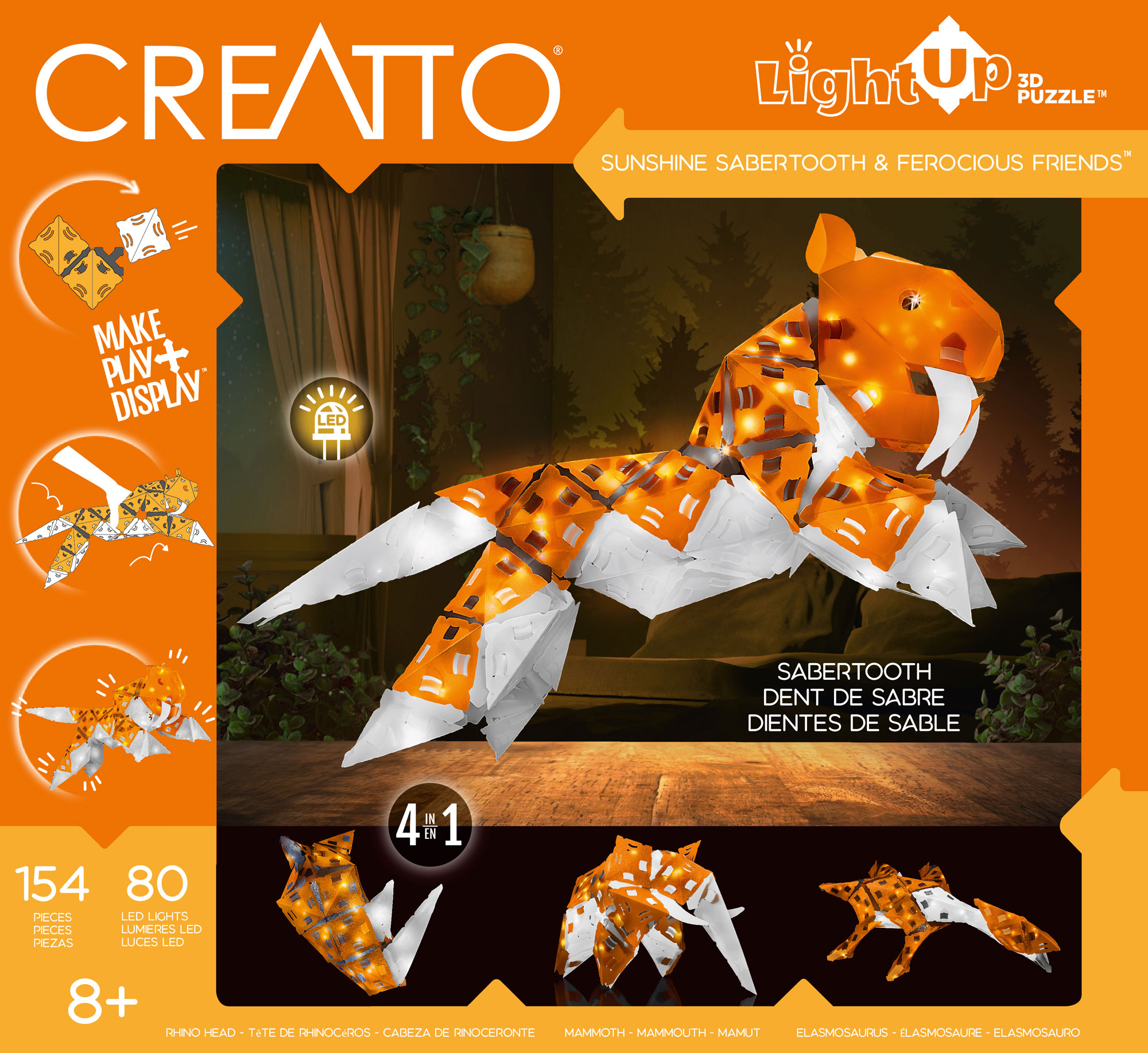 Creatto - vienkārša, bet universāla sistēma, kurā ir tikai divi galvenie komponenti, kurus var apvienot bezgalīgos 3D veidojumos. Izturīgās un elastīgās plastmasas detaļas ir ātri un viegli savienojamas visos prasmju līmeņos; nav nepieciešami papildu materiāli vai aprīkojums! Katram Creatto komplektam ir instrukcijas četru dažādu konfigurāciju izveidošanai, taču iespējas ierobežo tikai jūsu iztēle. Pievienojiet krāsainas gaismas diodes, lai izgaismotu jūsu mākslas darbu no iekšpuses.