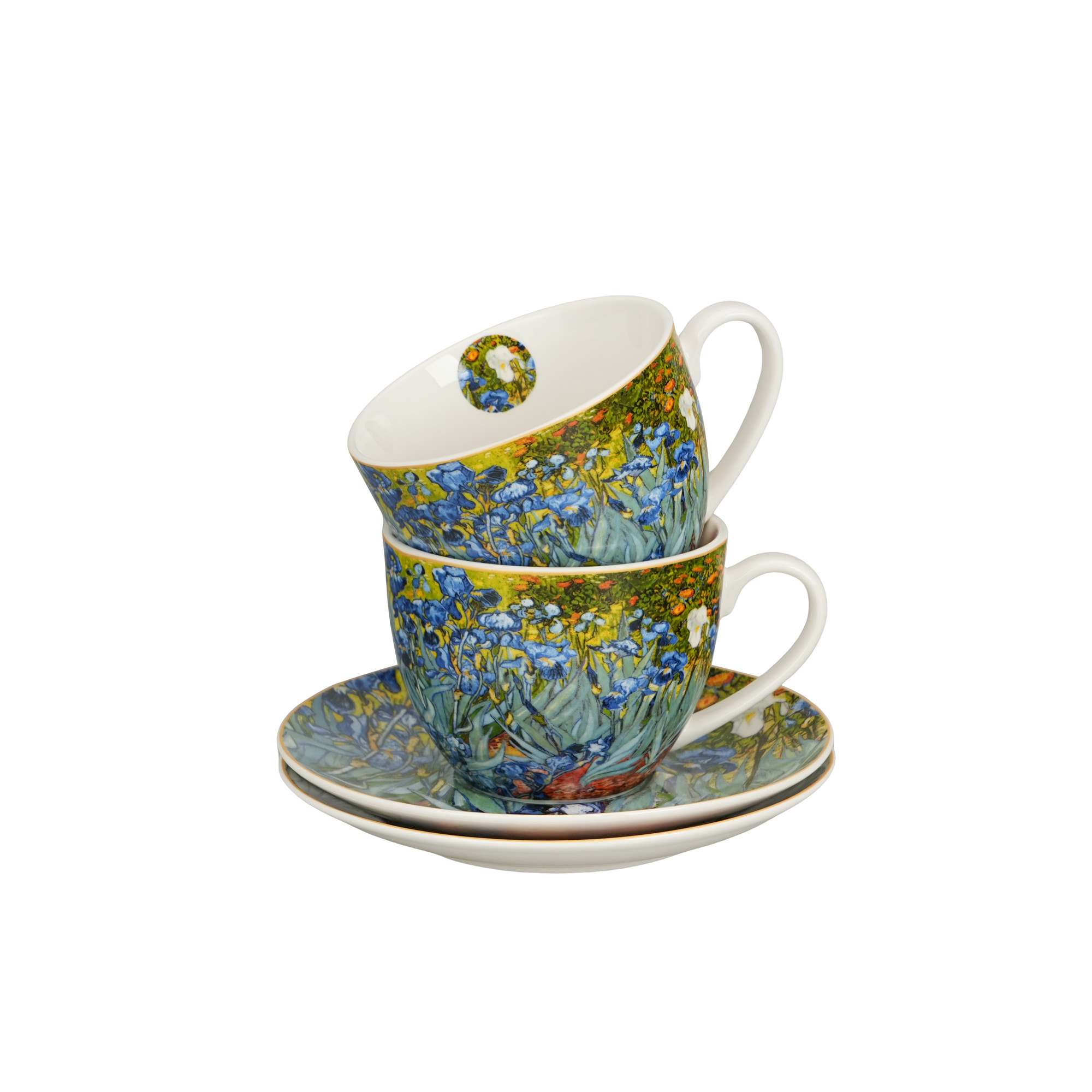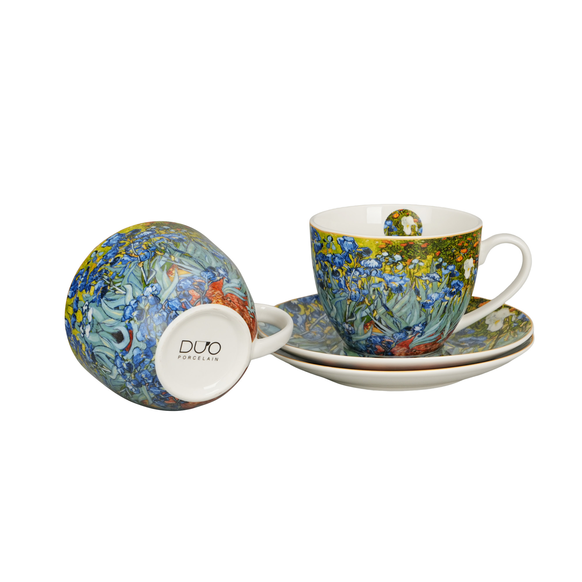 Komplekts “Irises” sastāv no divām tasītēm ar apakštasītēm, kas izgatavotas no augstas kvalitātes New Bone China porcelāna. Materiāls izceļas ar dabisku krēmīgi baltu nokrāsu, vieglu spīdumu un augstu izturību, vienlaikus saglabājot trauku vieglumu un smalku eleganci.