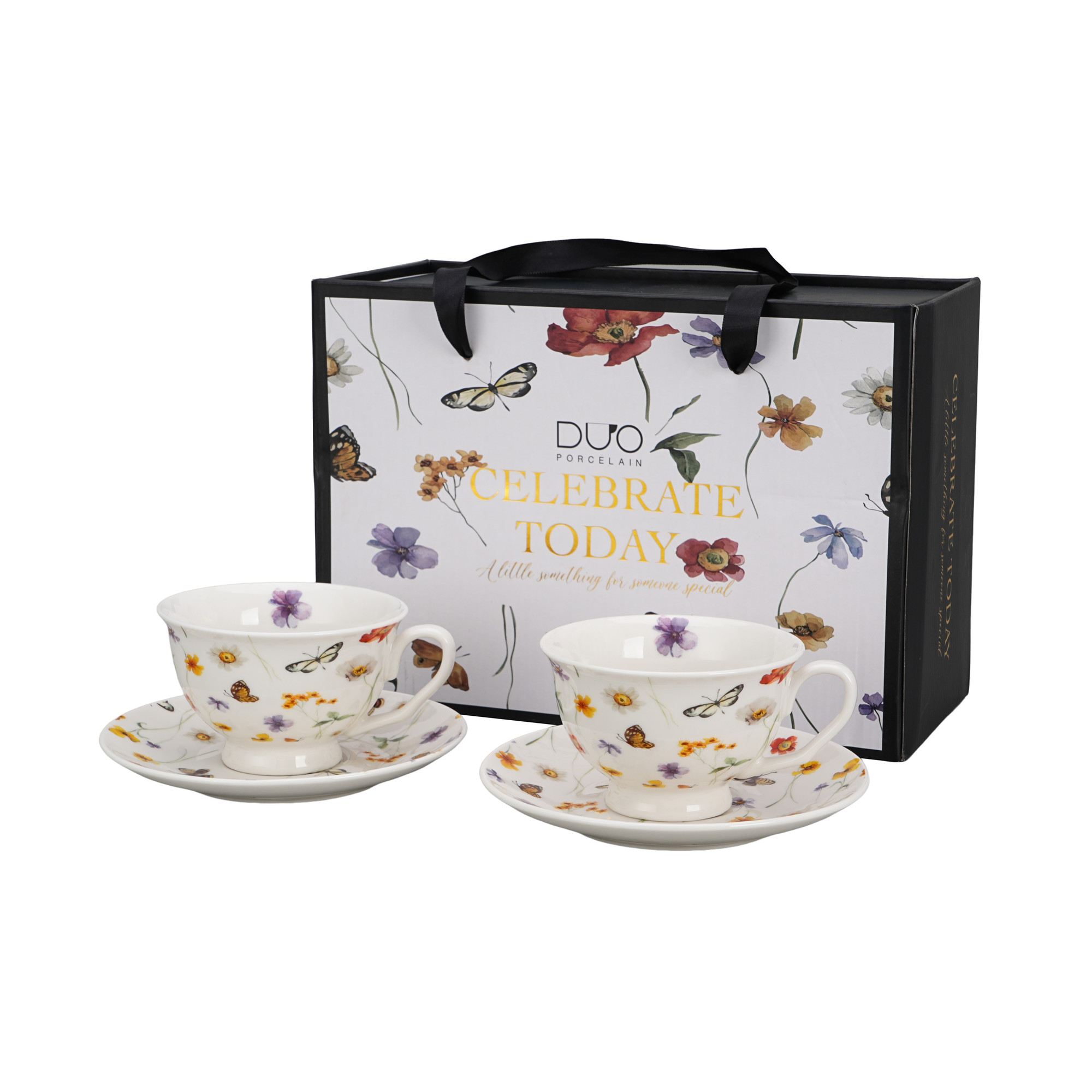 Divu tasīšu ar apakštasītēm komplekts Margaret no kolekcijas Kwiaty Royal izgatavots no augstas kvalitātes New Bone China porcelāna, kas izceļas ar maigi krēmīgu baltumu, vieglu spīdumu un izturību.