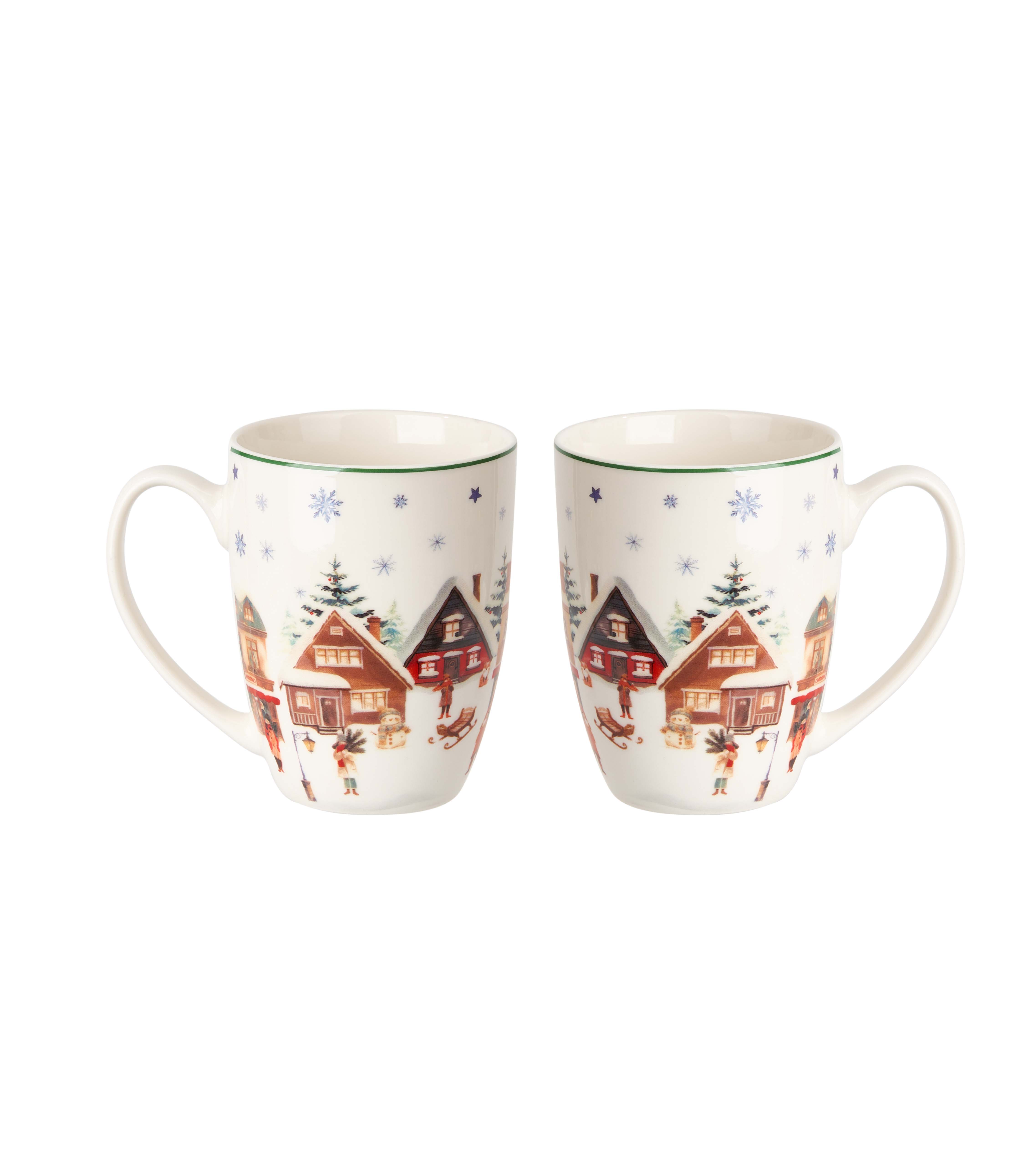 Divu krūžu komplekts Christmas Village no Ziemassvētku kolekcijas izgatavots no augstas kvalitātes New Bone China porcelāna, kas izceļas ar elegantu, maigi krēmīgu baltumu, smalku spīdumu un izturību.