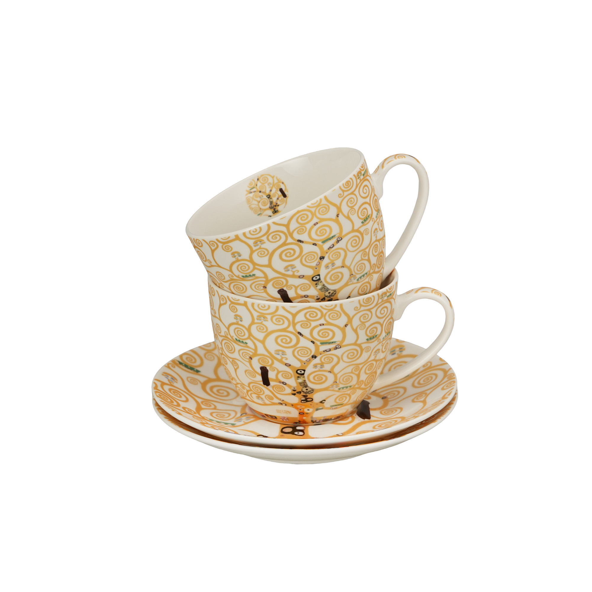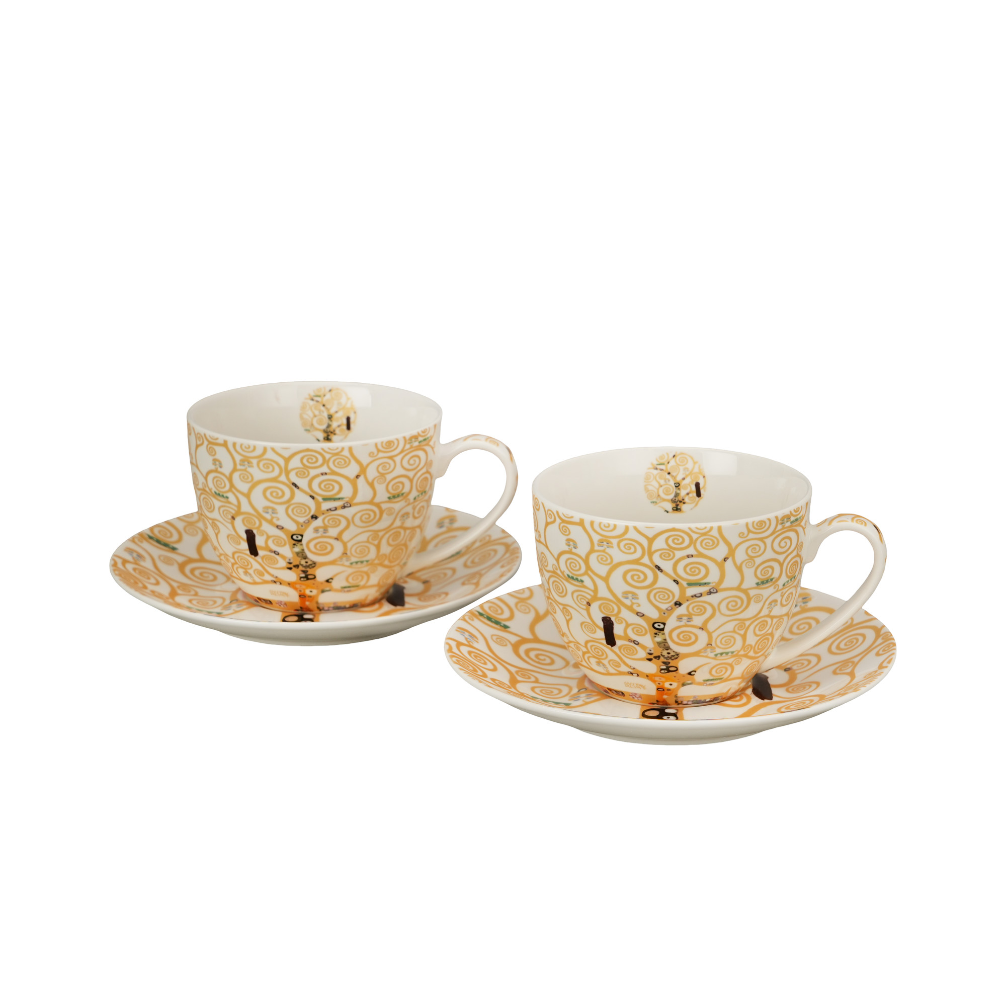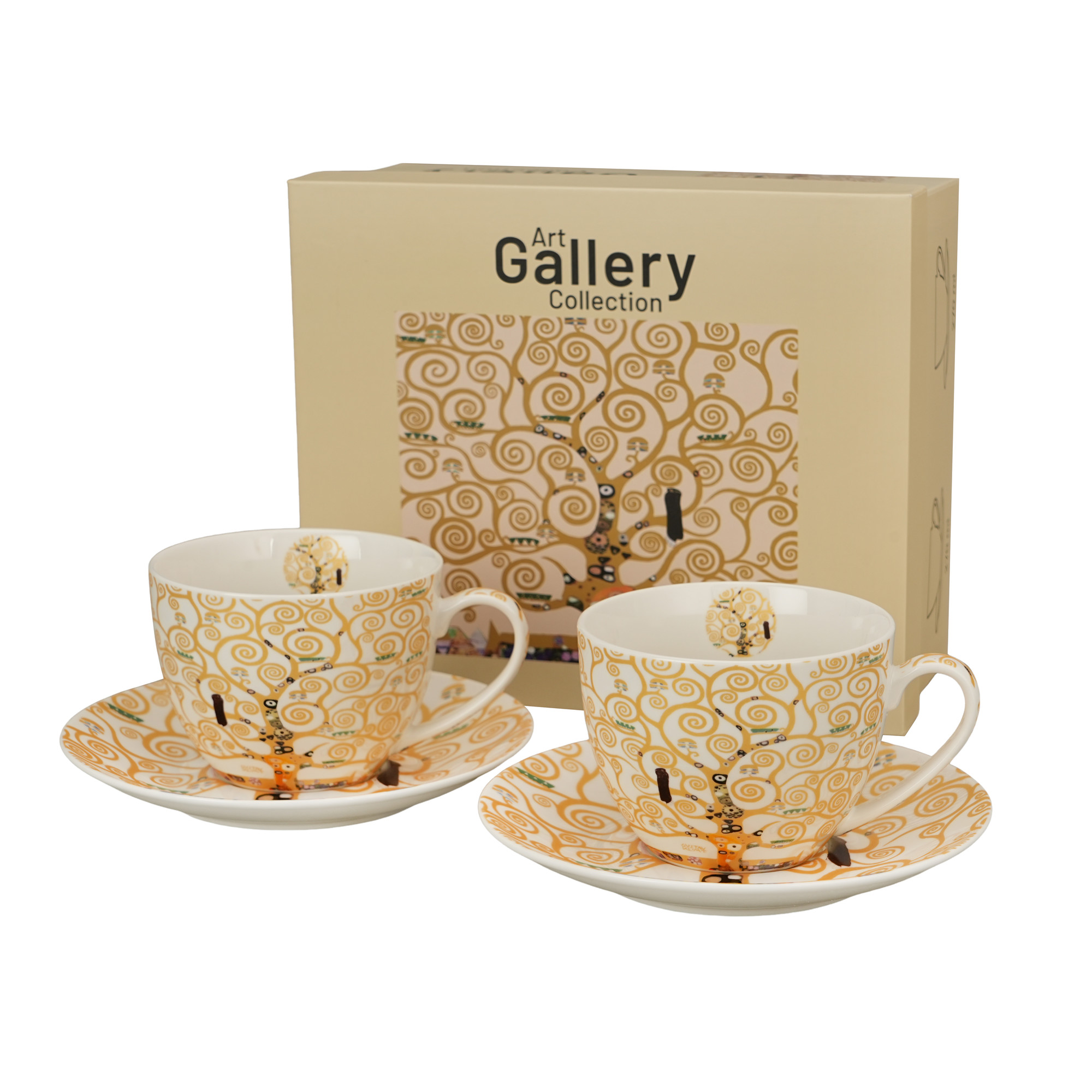 Divu tasīšu ar apakštasītēm komplekts Tree of Life Ecru inspired by Gustav Klimt no kolekcijas Art Gallery izgatavots no augstas kvalitātes New Bone China porcelāna, kas izceļas ar maigi krēmīgu baltumu, vieglu spīdumu un izturību.