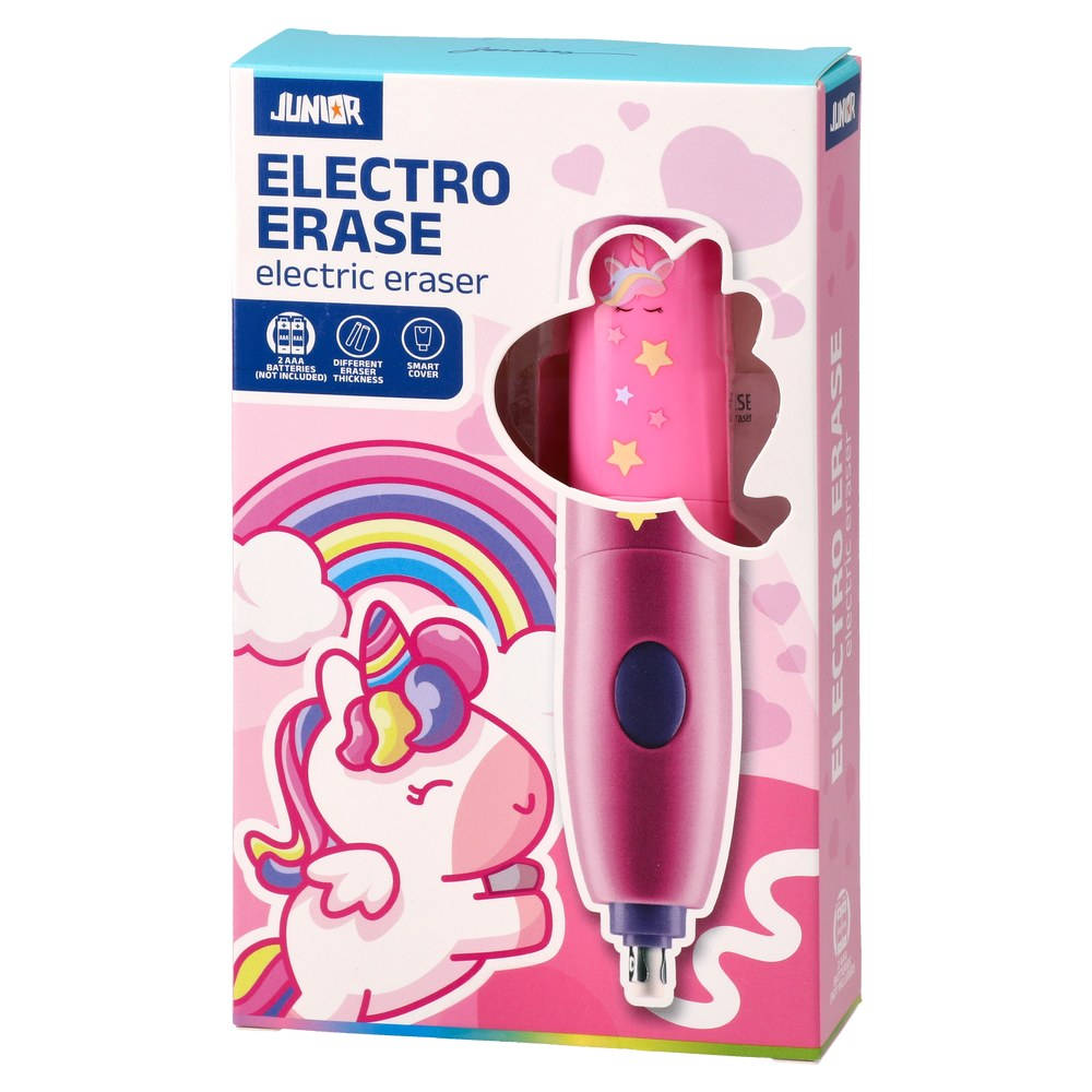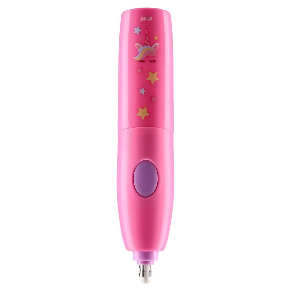 Elektriskā dzēšgumija ar kompaktu plastmasas korpusu rozā krāsā un modernu vienradža motīvu. Vienkārša darbība ar pogu un plānu cilindrisku dzēšgumiju.
