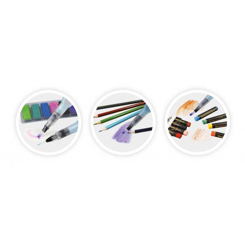 Komplektā ietilpst: 1 kaste ar rokturi, viens 35 lapu skiču bloks -300 g, 2 uzpildāmas ūdens otas, 12 krāsu kūkas, 8 eļļas pasteļi, 24 divpusēji flomāsteri, 18 akvareļu zīmuļi, 12 gēla pildspalvas, 2 zīmuļi, 1 dzēšgumija, 1 lineāls, 1 zīmuļu asināmais un 1 instrukcija ar krāsu ilustrācijām.