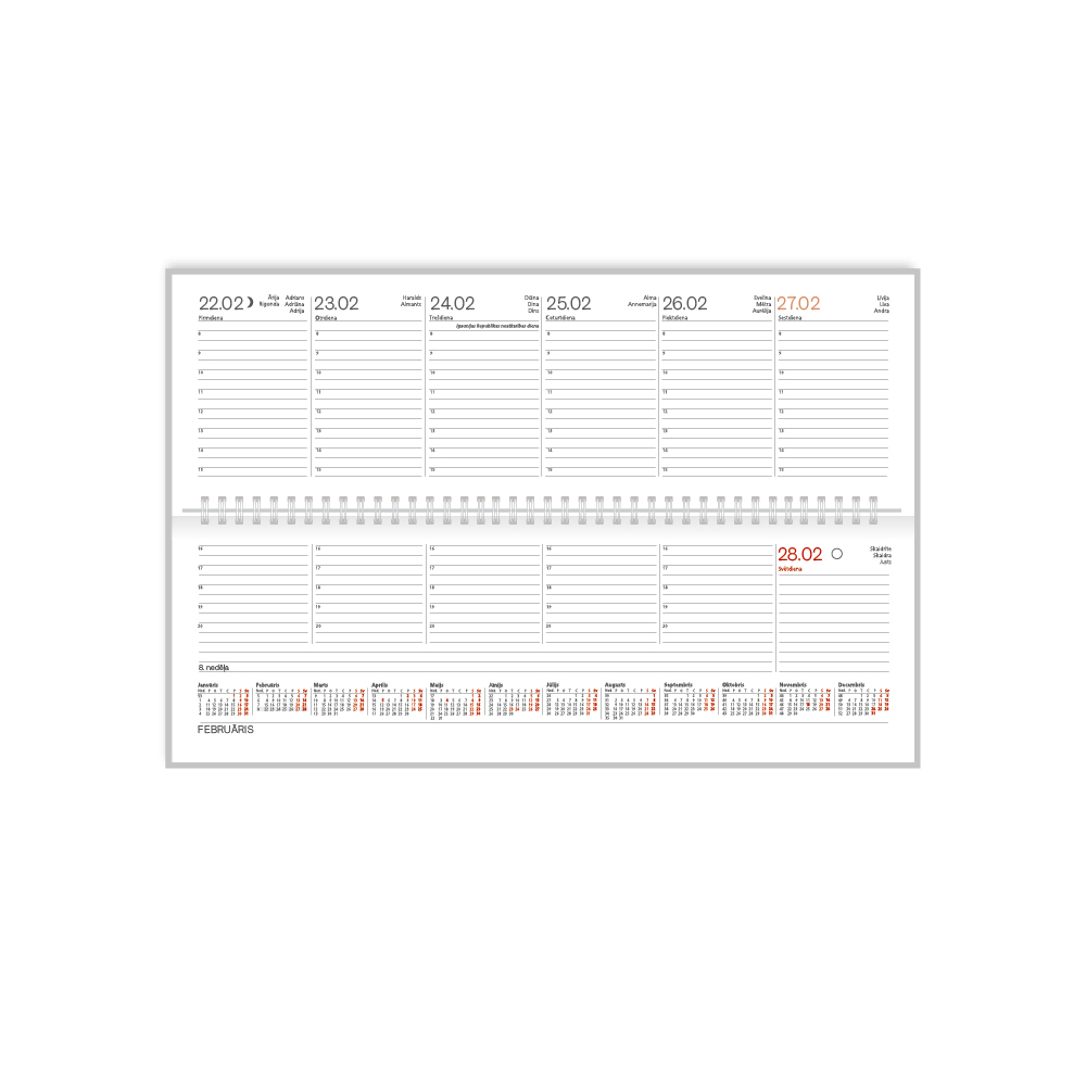 Galda plānotājs ar stingriem kartona vākiem. CREDO būs lielisks sabiedrotais ikdienas darbu un tikšanos plānošanā, jo kalendārā diena ir sadalīta ik pa stundai.