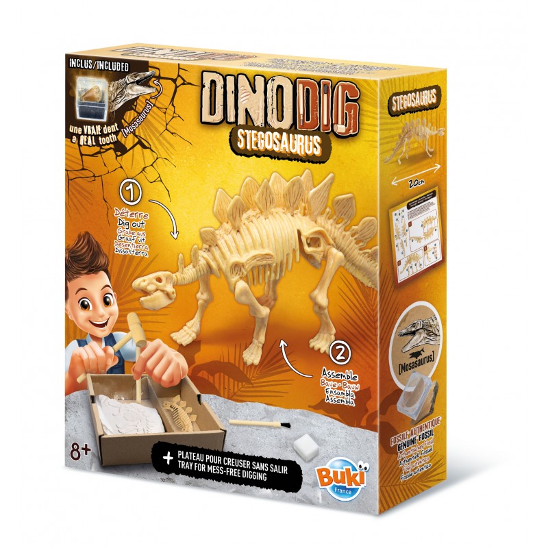 Komplektā ietilpst: 1 āmurs, 1 kalts, 1 sūklis, 1 paplāte, 1 dinozaura skelets izrakšanai, 1 īsta fosilija un 1 buklets.