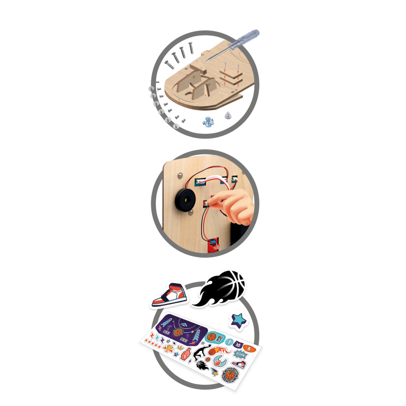 Komplekts sava elektroniskā basketbola groza izgatavošanai. Izmantojot komplektā iekļauto skrūvgriezi, bērni var droši salikt rezultātu tablo, vadības paneli, skaļruni un bateriju nodalījumu – lodēšana nav nepieciešama. Pielāgojiet grozu ar komplektā iekļautajām uzlīmēm.