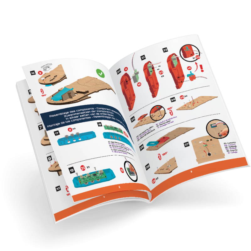 Komplektā ietilpst: 6 iepriekš sagriezti koka gabali, 3 mini spēļu dēļi, 10 bumbiņas, 1 skrūvgriezis un skrūves, 1 uzlīmju lapa un 1 krāsaina ilustrēta instrukcija.