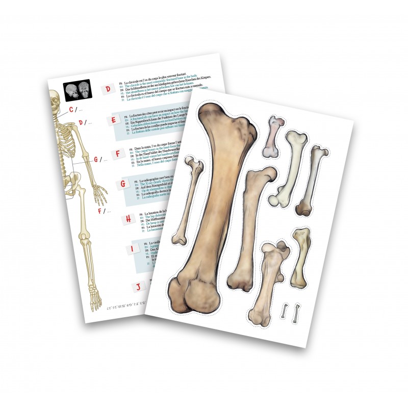 Komplektā ietilpst: 1 skelets 45 cm, 10 rentgena uzņēmumi, 10 aktivitātes, 1 pamatne, uzlīmes un 1 instrukcija.