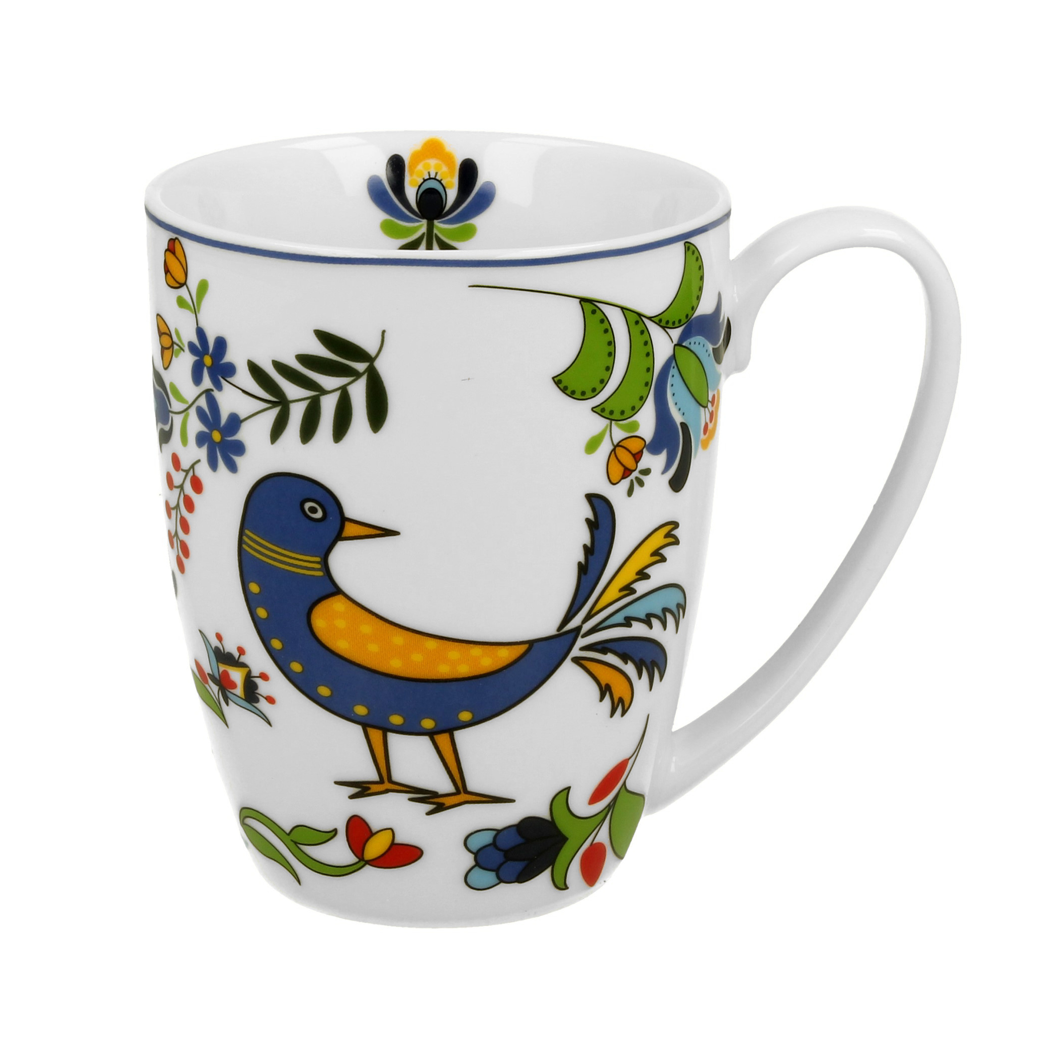 Šī ETNO kolekcijas krūze ir izgatavota no augstas kvalitātes New Bone China porcelāna, kas izceļas ar izturību, vieglumu un krēmīgi baltu spīdumu. Krūzes dizainu rotā košs putns ziedu ieskāvumā, kas iedvesmots no tradicionālās Kašubijas mākslas motīviem. Dzīvīgie toņi skaisti kontrastē ar porcelāna baltumu, radot siltu un priecīgu noskaņu.