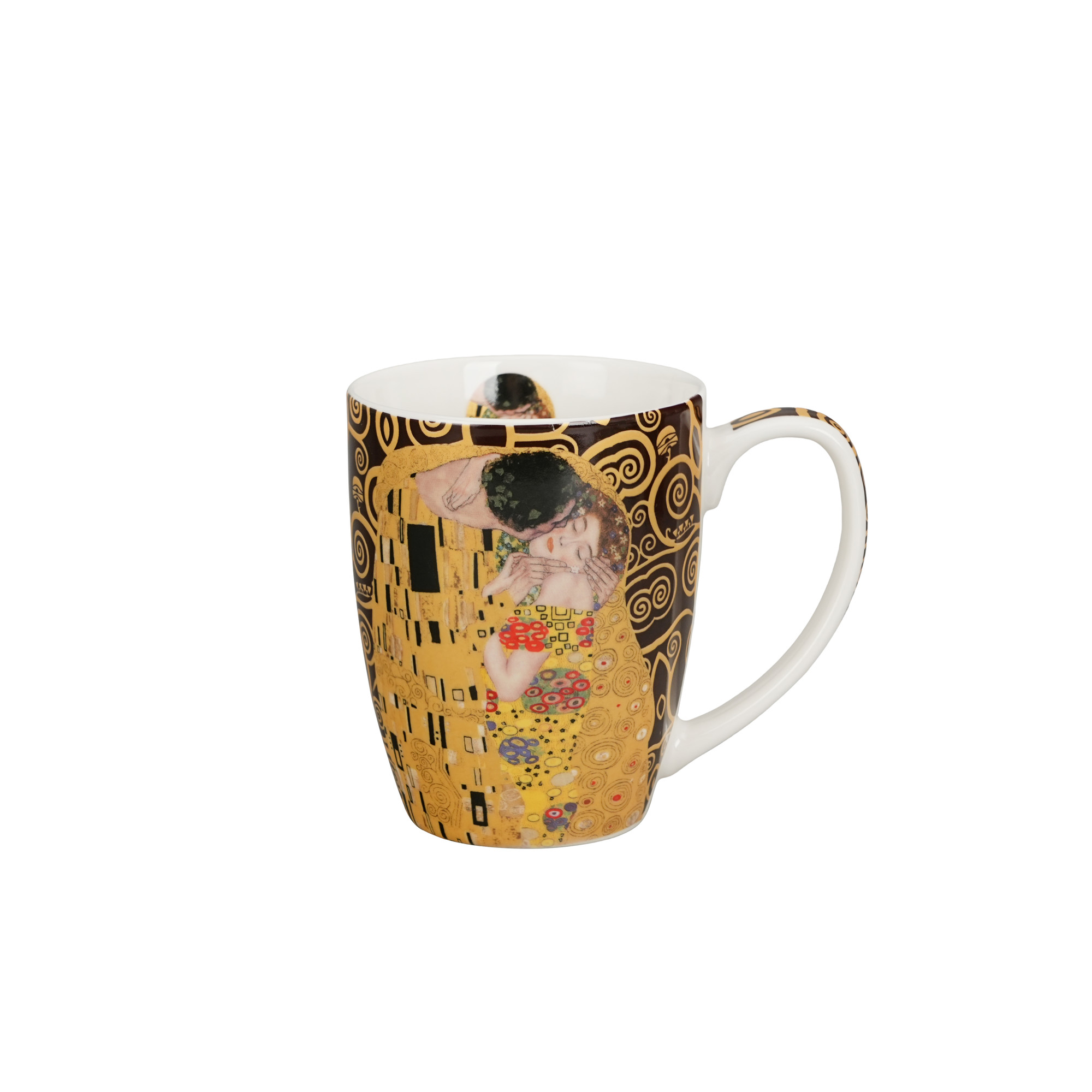 Krūzes ārpusi rotā Gustava Klimta slavenā gleznojuma “Skūpsts” reprodukcija. Siltie brūnie toņi un zeltainie akcenti piešķir traukam izsmalcinātu eleganci un māksliniecisku raksturu, kas uzrunās gan mākslas cienītājus, gan ikvienu, kas novērtē gaumīgu dizainu.