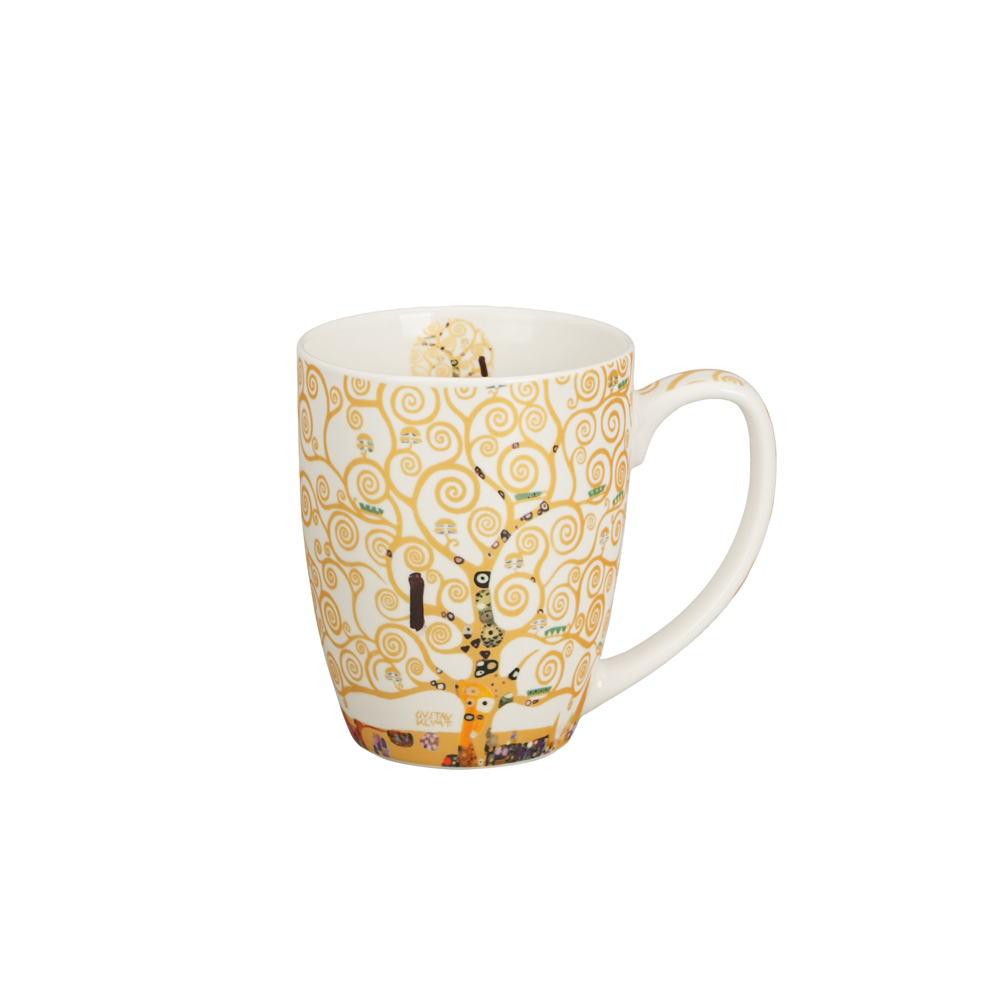 Krūzes ārpusi rotā Gustava Klimta iedvesmots mākslas darbs “Dzīvības koks”. Siltie brūnie toņi uz krēmīga fona un zeltainie akcenti piešķir krūzei izsmalcinātu eleganci un māksliniecisku raksturu, kas harmoniski apvieno klasiku ar mūsdienīgu stilu.