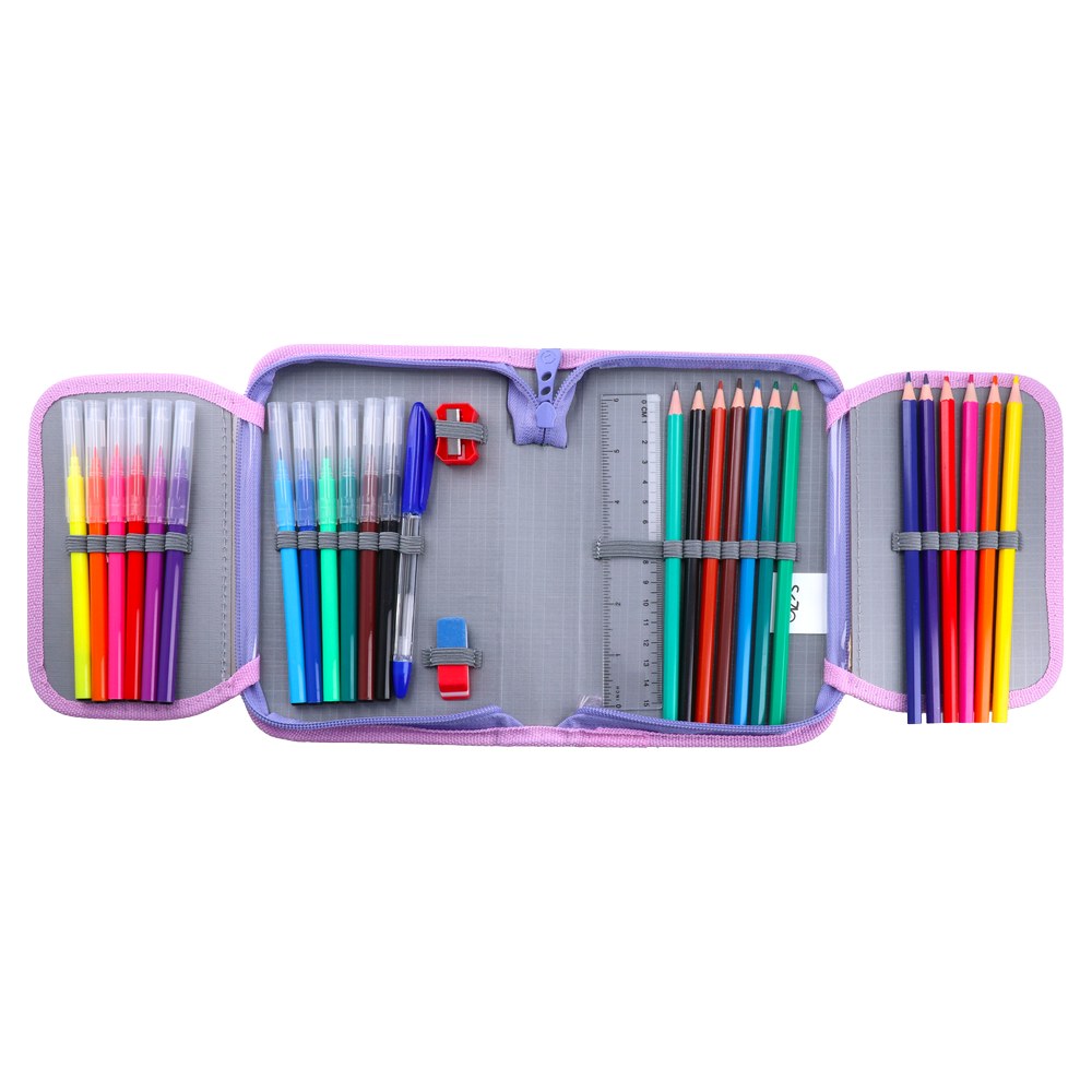 Penālis ir izgatavots no augstas kvalitātes materiāla. Tas ir pildīts ar skolas piederumiem un satur: 12 zīmuļus, 12 flomasterus, grafīta zīmuli, lodīšu pildspalvu, zīmuļu asināmo, dzēšgumiju un lineālu.