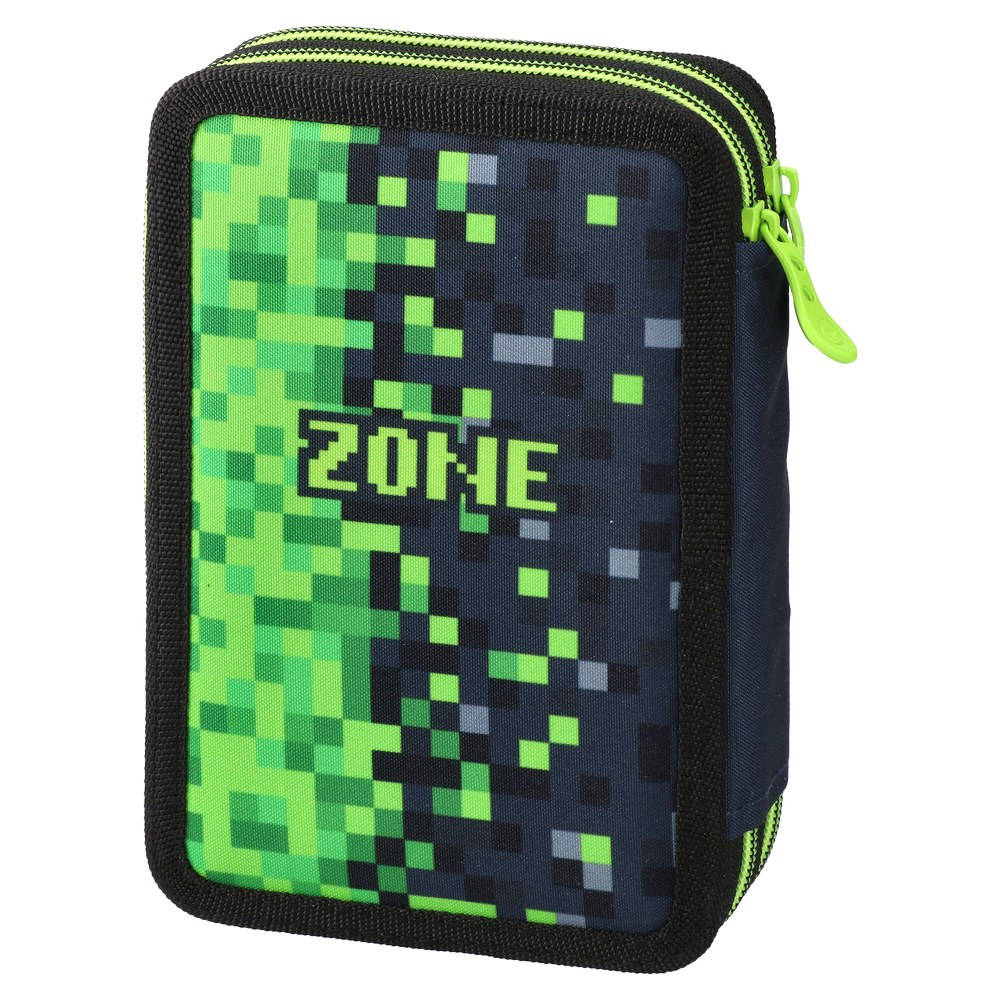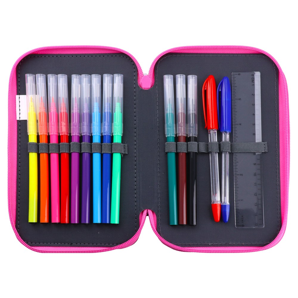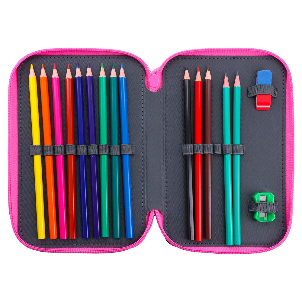 Divdaļīgais penālis izceļas ar savu oriģinālo dizainu un ir izgatavots no augstas kvalitātes materiāla. Tas ir pildīts ar skolas piederumiem un satur: 12 zīmuļus, 12 flomasterus, 2 grafīta zīmuļus, 2 lodīšu pildspalvas, zīuļu asināmo, dzēšgumiju un lineālu.