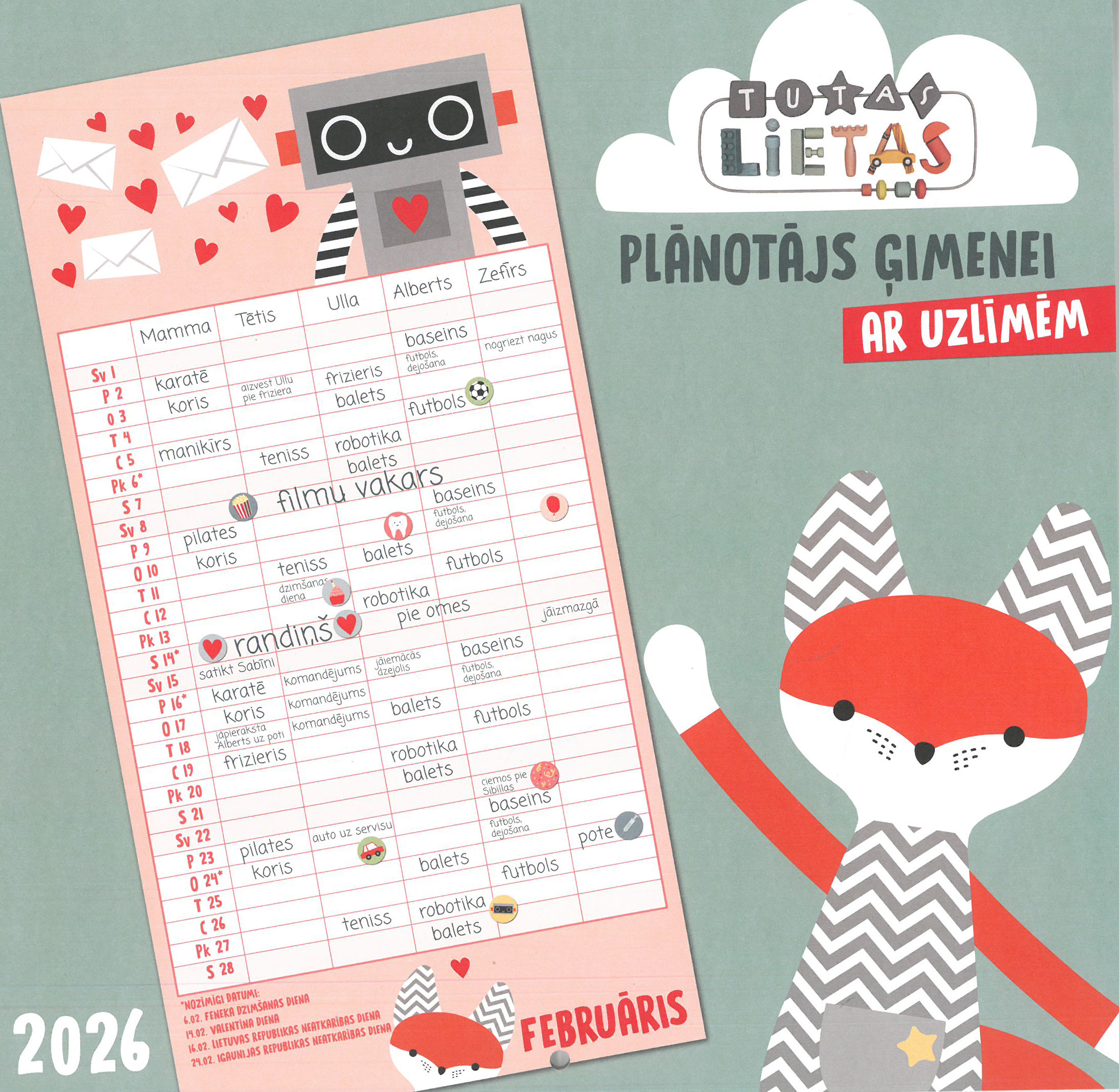 Krāsains sienas kalendārs, kas palīdzēs plānot aktivitātes katram ģimenes loceklim un visai ģimenei kopā. Lapsa kalendārā atzīmējusi svinamos un svarīgos datumus, bet Āpsītis pievienojis skaistas uzlīmes, kas ļaus vienkārši un jautri organizēt mēneša plānus arī pašiem mazākajiem.