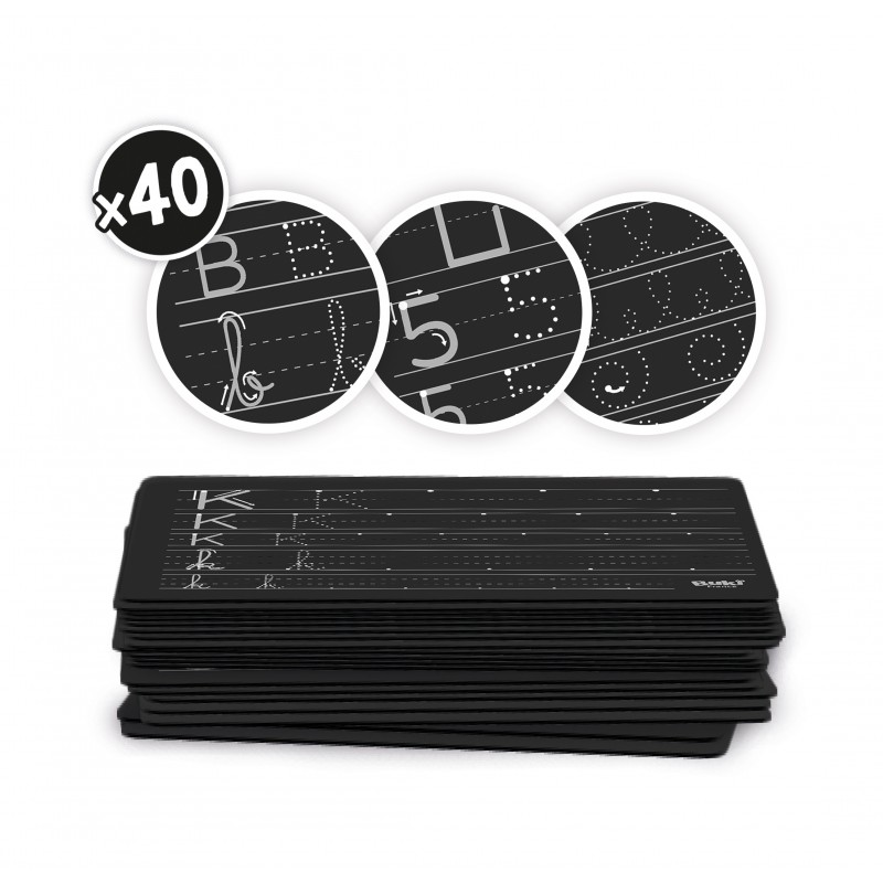 Turklāt iemācieties zīmēt izliektas un taisnas līnijas. Bērns novieto lapu zem planšetes un praktizējas, velkot līnijas uz katras lapas. Dzēsiet, vienkārši nospiežot pogu! Rakstiet, izmantojot irbuli kā pildspalvu. Pievienojiet rokturi, lai iemācītos pareizi turēt pildspalvu. Šo rokturi var izmantot arī vienai no savām pildspalvām.
