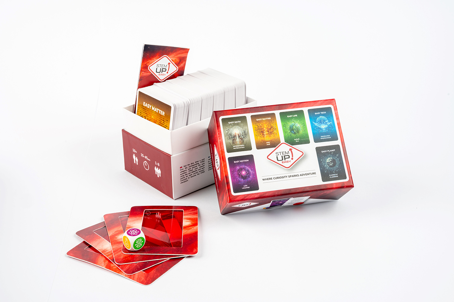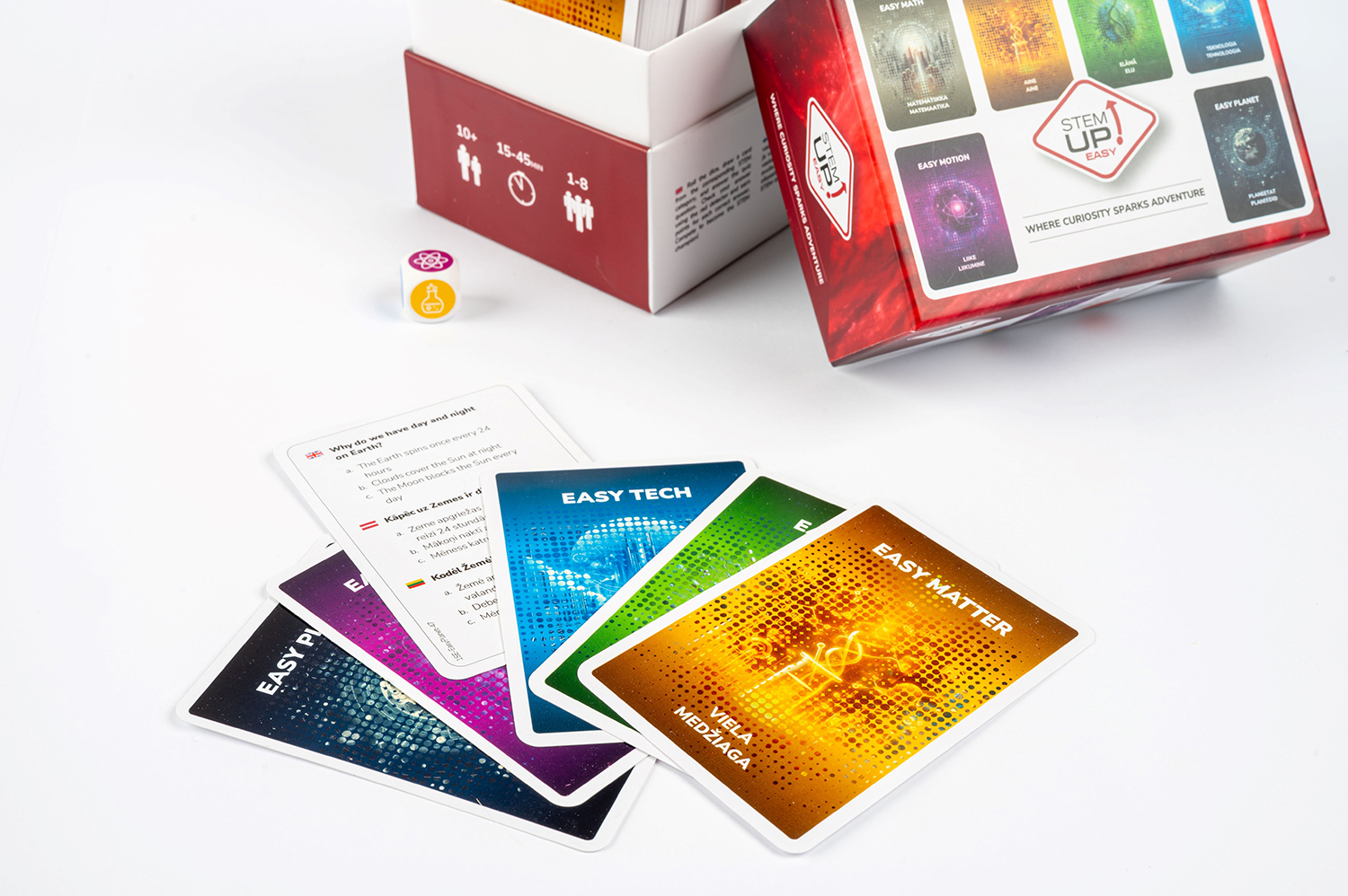 STEM UP! Easy ir gudra un enerģijas pilna viktorīnas spēle, kas pārvērš zinātni, matemātiku un tehnoloģijas tīrā priekā. Tā ir speciāli izstrādāta bērniem vecumā no 10 gadiem. Tā apvieno zinātkāri, sacensības garu un radošumu – viss vienā krāsainā spēlē, ko var baudīt ikviens.