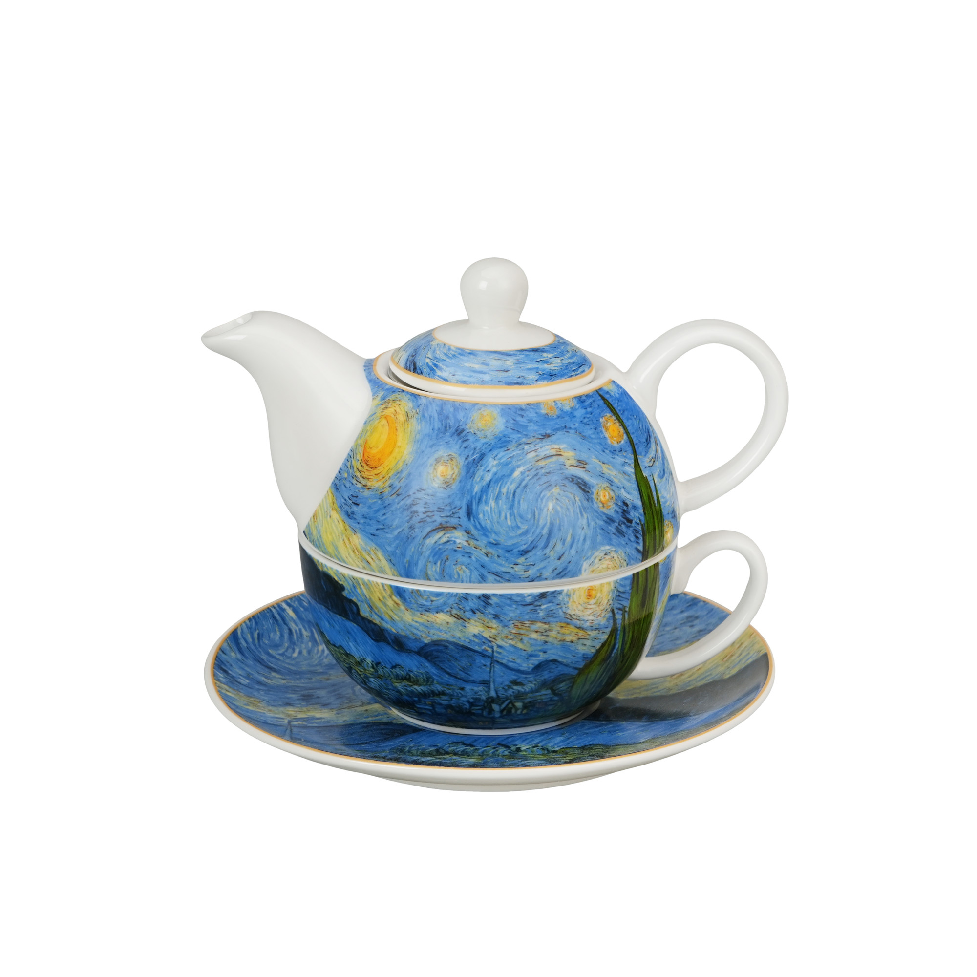 Tasītes iekšpusi rotā fragments no Vincenta van Goga gleznas “Zvaigžņotā nakts”. Tumšo un gaišo toņu kontrasts piešķir dizainam izteiksmīgu, emocionālu noskaņu. Komplekts iepakots dekoratīvā kastītē, padarot to par gaumīgu dāvanu vai estētisku papildinājumu ikdienas tējas baudīšanai.