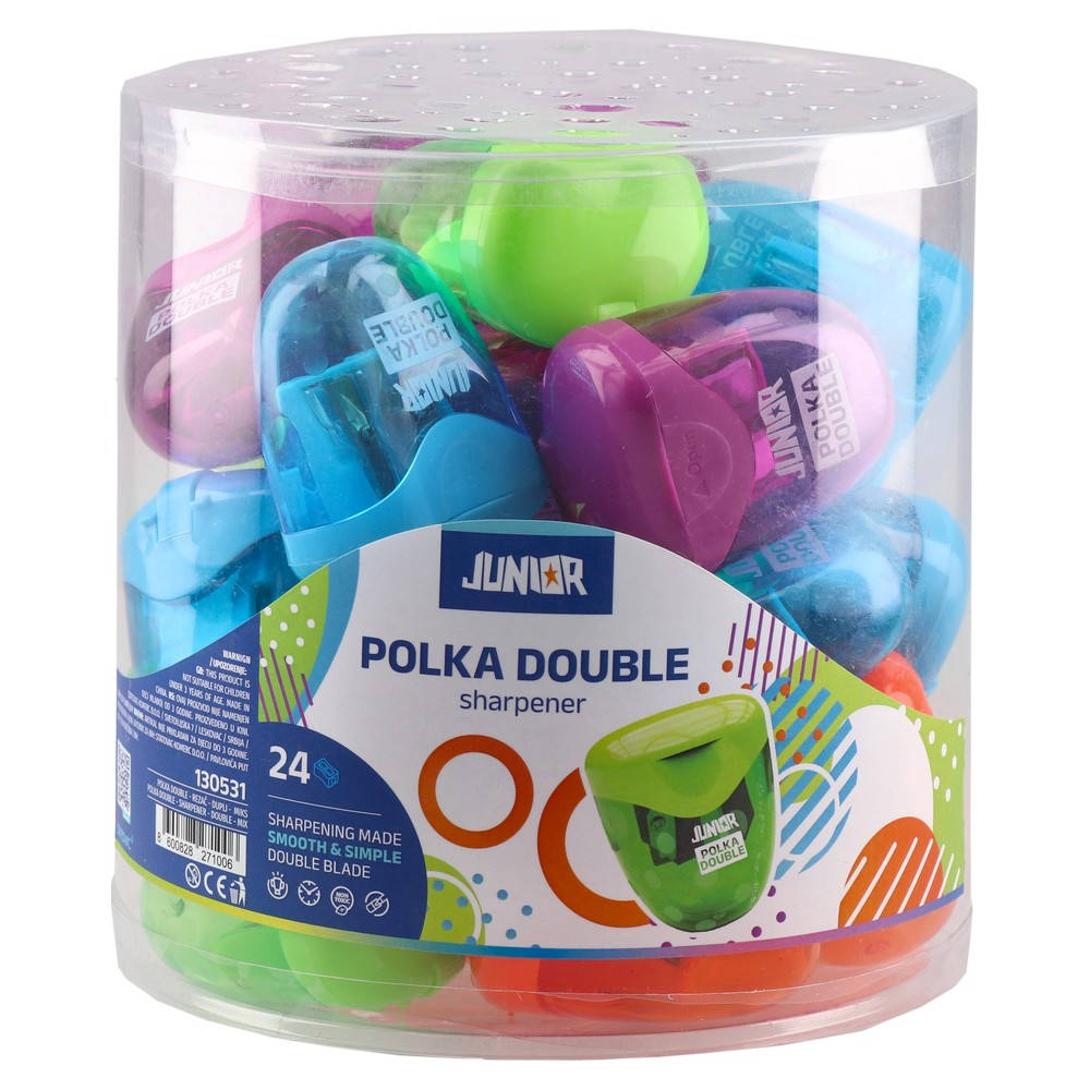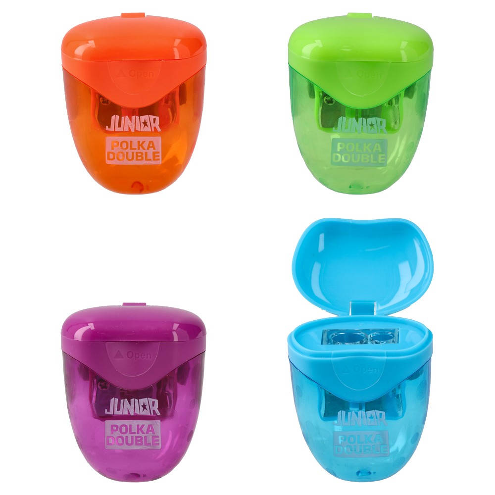 Zīmuļu asināmais ar ļoti pievilcīgu un interesantu formu, augstas kvalitātes konstrukciju ar metāla asmeni, ar diviem caurumiem platākiem un šaurākiem zīmuļiem un atkritumu tvertni.